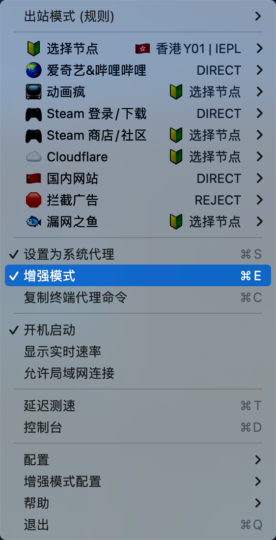 如果想实现其他软件也走代理,那就是全局代理,类比之下,也就是 ClashX 的【增强模式】